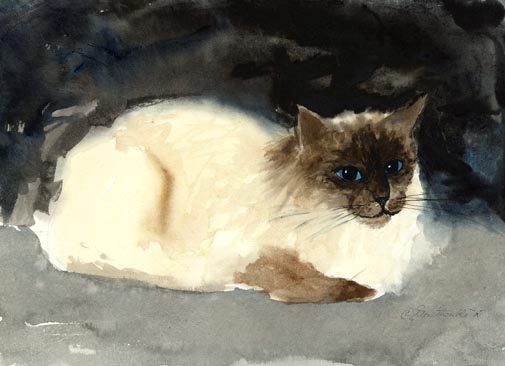 Mr. Nippy Matted Artist's Proof of an original Drew Strouble cat art watercolor painting of a Seal Point Birman. Limited Edition of: 50 Artist's Proofs ¥ Overall size: 14 1/2" x 18" incl. 2 1/2" mat. ¥ Each print is hand signed, titled & numbered with matching Certificate of Authenticity. All prints are shrink wrapped with a white mat and foamcore backing.