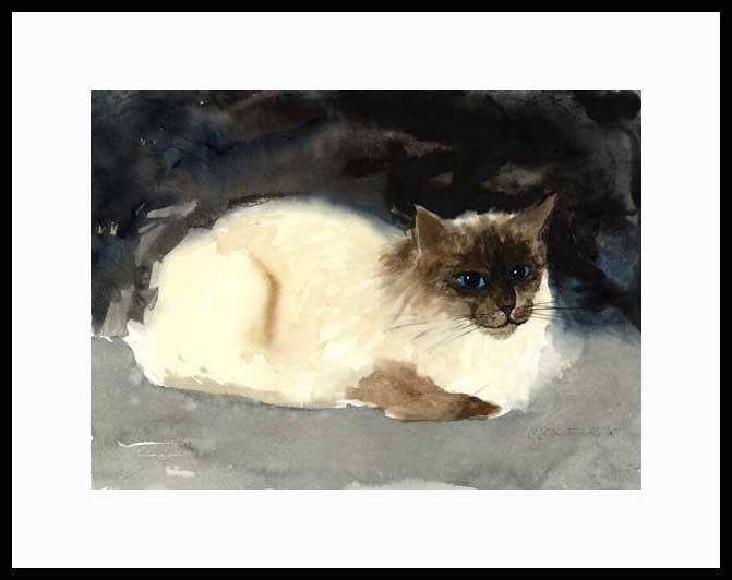 This is a watercolor of our Seal Point Birman, Mr. Nippy. I did a quick pencil sketch from life and then painted it in my studio from memory.