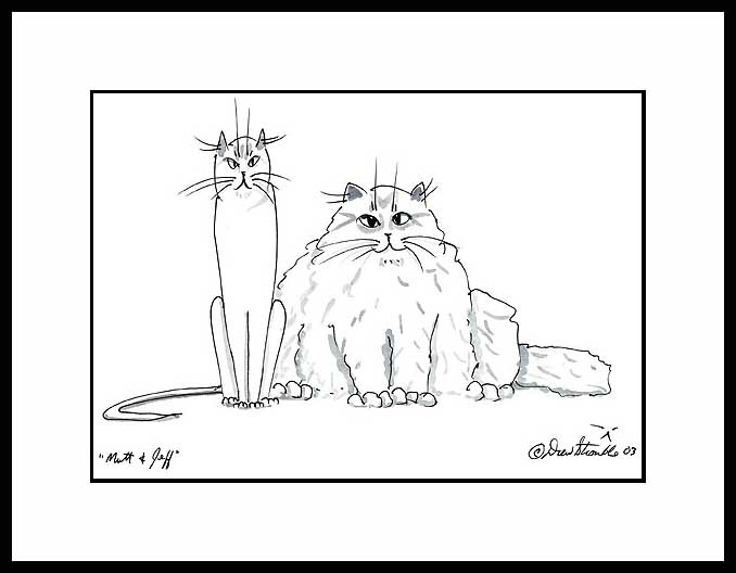 Mutt and Jeff Framed Open Edition Mini Print of an original Drew Strouble cat art pen, ink and watercolor drawing of a skinny cat and fat cat. Open Edition Mini Prints • Overall size: 9 3/4" x 11 5/8" incl. 2" mat. • Each print is hand signed and titled. All prints are shrink wrapped with a white mat and foamcore backing. Designer Frames are black aluminum with plexiglas.