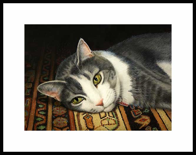 Musing on a Magic Carpet Framed Limited Edition is an original Drew Strouble cat art painting of a stunning gray-white Tabby on a magic carpet. Limited Edition of: 950 Prints. Overall size: 14 1/2" x 18" incl. 2 1/2" mat. Each print is hand signed, titled & numbered with matching Certificate of Authenticity. All prints are shrink wrapped with a white mat and foamcore backing. Designer Frames are black aluminum with plexiglas.