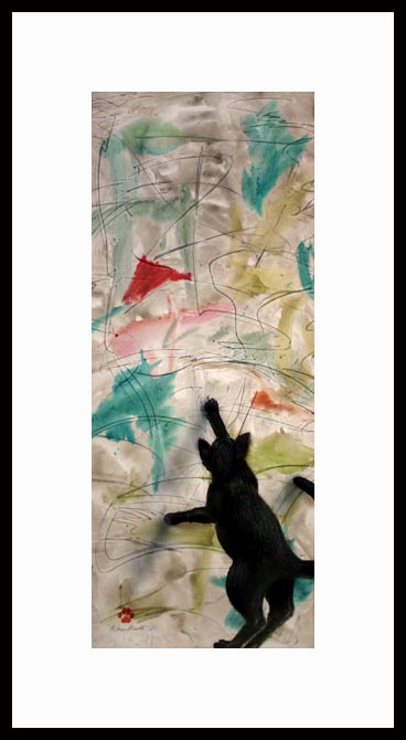 My Cat Paints II Framed Open Edition Mini Print of an original Drew Strouble cat art watercolor painting of a black cat with a flair for abstract painting with claw marks. Open Edition Mini Prints. 7 1/2" x 12" incl. 2" mat. Each print is hand signed and titled. All prints are shrink wrapped with a white mat and foamcore backing. Designer Frames are black aluminum with plexiglas.