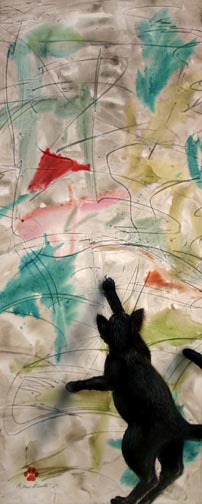 My Cat Paints II Matted Limited Edition of an original Drew Strouble cat art watercolor painting of a black cat with a flair for abstract painting with claw marks. Limited Edition of: 950 Prints. Overall size: 11 1/2" x 20 1/2" incl. 2 1/2" mat. Each print is hand signed, titled & numbered with matching Certificate of Authenticity. All prints are shrink wrapped with a white mat and foamcore backing.