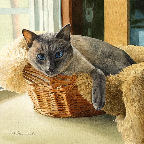 Hi Drew, Coincidentally, we have a male seal point Siamese named Rocky! These will make a total of 6 of your Siamese prints we have. I was excited to find color ink prints in a shop in Siesta Key while on vacation in Sarasota in June this year. We first heard of you on our vacations over the years there. We have 3 seal point Siamese: Rocky and siblings Toby and Macy. "Meezers" has a particular place of honor on our mantel over the fireplace and is my favorite. Love your Meezers! Thanks, Drew. -Renee