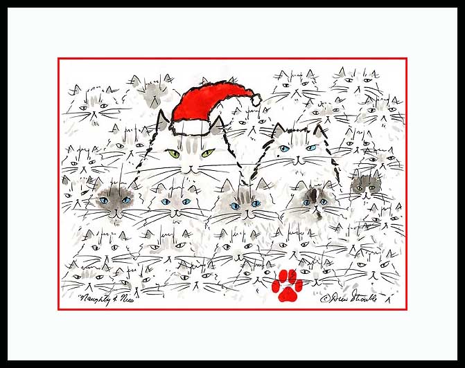 Drew Strouble's brush and ink and watercolor colorful Santa cat and Christmas cats.