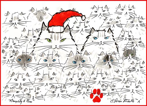 Naughy 'n Nice Matted Open Edition Mini Print of an original Drew Strouble cat art brush and ink colorful Santa cat and Christmas cats. Open Edition Mini Prints. Overall size: 9 3/4" x 11 5/8" incl. 2" mat. Each print is hand signed and titled. All prints are shrink wrapped with a white mat and foamcore backing.
