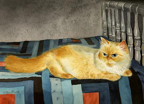 New Arrival Matted Artist's Proof of an original Drew Strouble cat art painting of a Flame Point Himalayan Cat on a patch work quilt. Limited Edition of: 50 Artist's Proofs. Overall size: 14 1/2" x 18" incl. 2 1/2" mat. Each print is hand signed, titled & numbered with matching Certificate of Authenticity. All prints are shrink wrapped with a white mat and foamcore backing.