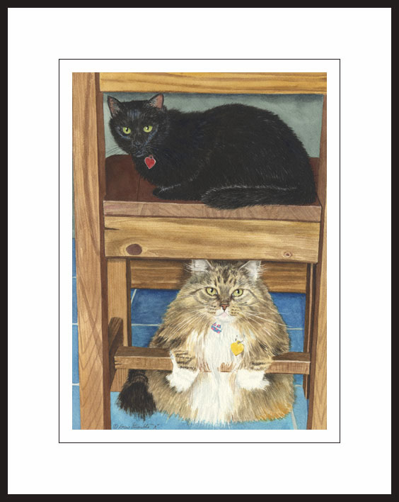 Framed Artist's Proof of an original Drew Strouble cat art painting of two beautiful cats. One a Maine Coon and the other a domestic black short hair. Limited to 50 Artist's Proofs. Overall size Approx.: 14 1/2" x 18" incl. 2 1/2" mat. Each print is hand signed, titled & numbered with matching Certificate of Authenticity. All prints are shrink wrapped with a white mat and foamcore backing. Black frames are high quality extruded anodized aluminum with plexiglas for safe shipping.