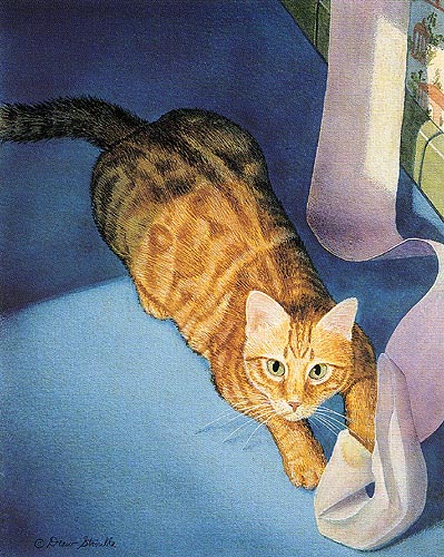 No Privacy Matted Artist's Proof of an original Drew Strouble cat art watercolor painting of an Orange Tabby Cat unravelling toilet paper. Limited Edition of: 50 Artist's Proofs. Overall size: 14" x 16 3/8" incl. 2 1/2" mat. Each print is hand signed, titled & numbered with matching Certificate of Authenticity. All prints are shrink wrapped with a white mat and foamcore backing.
