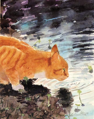 Oasis Card of an original Drew Strouble cat art painting of an Orange Tabby Cat at a pond. Open Edition Mini Prints ¥ 8 7/8" x 10" incl. 2" mat ¥ Each print is hand signed and titled. Designer Frames are black aluminum with plexiglas.
