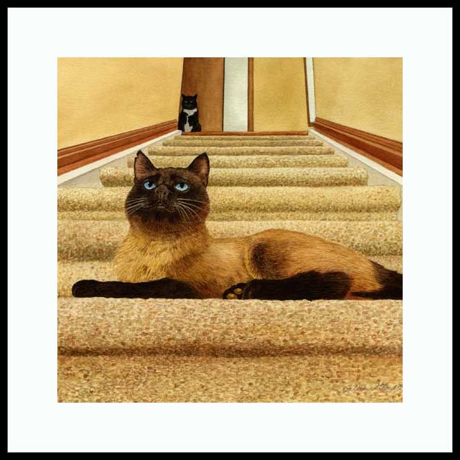 Obstacle Course Framed Open Edition Mini Print an original Drew Strouble cat art watercolor painting of a Seal Point Siamese on a staircase. Open Edition Mini Prints ¥ Overall size: 10" x 10" incl. 1 1/2" mat. ¥ Each print is hand signed and titled. All prints are shrink wrapped with a white mat and foamcore backing. Designer Frames are black aluminum with plexiglas.