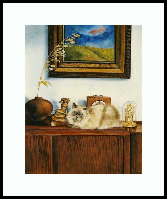 Objets d'Arts Framed Artist's Proof is an original Drew Strouble cat art painting of a Blue Point Himalayan Cat with art objects. Limited Edition of: 50 Artist's Proofs ¥ Overall size: 14" x 16 3/8" incl. 2 1/2" mat. ¥ Each print is hand signed, titled & numbered with matching Certificate of Authenticity. All prints are shrink wrapped with a white mat and foamcore backing. Designer Frames are black aluminum with plexiglas.