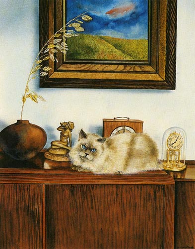 Objets d'Arts Matted Artist's Proof is an original Drew Strouble cat art painting of a Blue Point Himalayan Cat with art objects. Limited Edition of: 50 Artist's Proofs ¥ Overall size: 14" x 16 3/8" incl. 2 1/2" mat. ¥ Each print is hand signed, titled & numbered with matching Certificate of Authenticity. All prints are shrink wrapped with a white mat and foamcore backing.