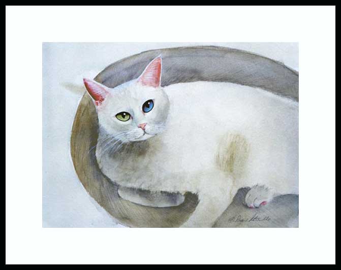 Odd-Eyed Jack Framed Open Edition Mini Print of an original Drew Strouble cat art watercolor painting of a White Cat with two different colored eyes. Open Edition Mini Prints � Overall size: 9 3/4" x 11 5/8" incl. 2" mat. � Each print is hand signed and titled. All prints are shrink wrapped with a white mat and foamcore backing. Designer Frames are black aluminum with plexiglas.