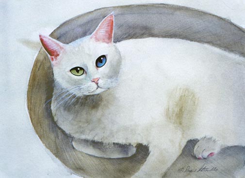 Odd-Eyed Jack Matted Open Edition Mini Print of an original Drew Strouble cat art watercolor painting of a White Cat with two different colored eyes. Open Edition Mini Prints ¥ Overall size: 9 3/4" x 11 5/8" incl. 2" mat. ¥ Each print is hand signed and titled. All prints are shrink wrapped with a white mat and foamcore backing.