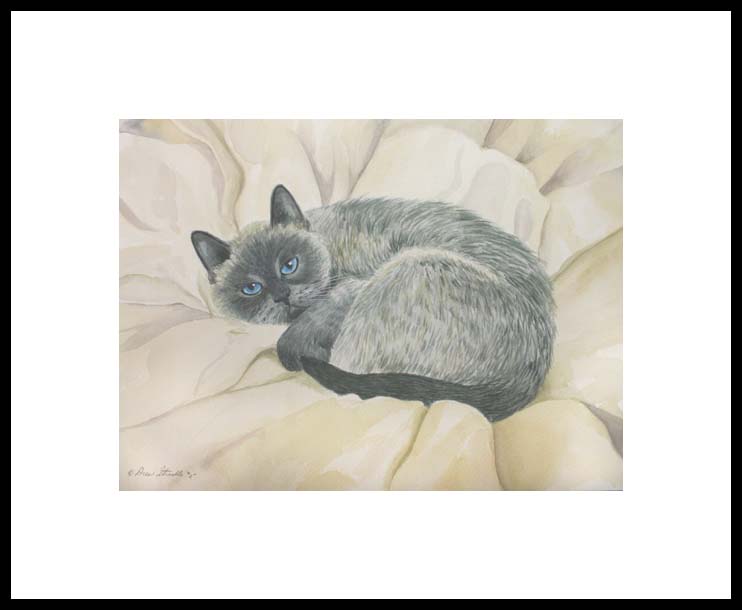 This beautiful Blue Point Siamese cat, Ol Blue Eyes, is taking a cat nap before a night of fun. This cat art print verison by Drew Strouble is a framed Artist's Proof with an overall size of 14 1/2" x 18" including a 2 1/2" white mat with a black beveled edge. Designer Frames are black aluminum with plexiglas. Each print is hand signed, titled & numbered with matching Certificate of Authenticity. There are only 50 Artist's Proofs.