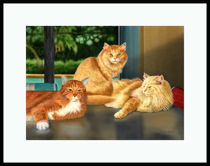 One Fur All and All Fur One Framed Limited Edition of an original Drew Strouble cat art watercolor of three Orange Cats. Limited Edition of: 950 Prints. Overall size: 18 1/2" x 24" incl. 3" mat. Each print is hand signed, titled & numbered with matching Certificate of Authenticity. All prints are shrink wrapped with a white mat and foamcore backing. Designer Frames are black aluminum with plexiglas.