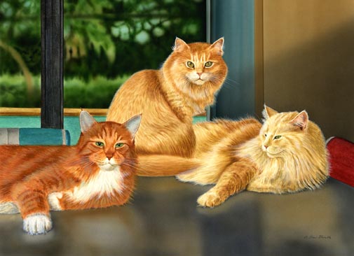 One Fur All and All Fur One Matted Limited Edition of an original Drew Strouble cat art watercolor of three Orange Cats. Limited Edition of: 950 Prints. Overall size: 18 1/2" x 24" incl. 3" mat. Each print is hand signed, titled & numbered with matching Certificate of Authenticity. All prints are shrink wrapped with a white mat and foamcore backing.