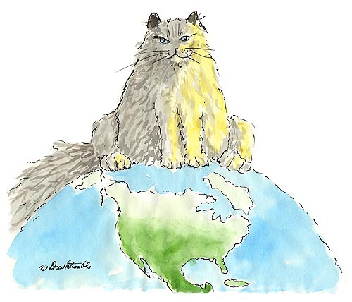 On Top of the World Matted Limited Edition of an original cat cartoon - cat art watercolor painting of a cool cat sitting on top of the world. Limited Edition of: 950 Prints. ¥ Overall size: 16 1/2" x 18" incl. 2 1/2" mat. ¥ Each print is hand signed, titled & numbered with matching Certificate of Authenticity. All prints are shrink wrapped with a white mat and foamcore backing. Designer Frames are black aluminum with plexiglas.