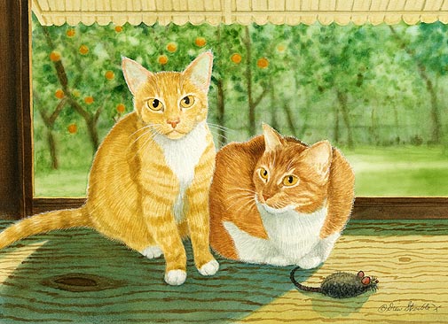 Orange Delight Matted Artist's Proof of an original Drew Strouble cat art watercolor painting of two orange and white tabby cats, a play mouse and a background of orange trees, available in fine art prints. Limited Edition of: 50 Artist's Proofs • Overall size: 14 1/2" x 18" incl. 2 1/2" mat. • Each print is hand signed, titled & numbered with matching Certificate of Authenticity. All prints are shrink wrapped with a white mat and foamcore backing.