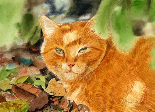 Orangy Matted Limited Edition of an original Drew Strouble cat art watercolor of an orange cat in nature with dappled light. Limited Edition of: 950 Prints. Overall size: 14 1/2" x 18" incl. 2 1/2" mat. Each print is hand signed, titled & numbered with matching Certificate of Authenticity. All prints are shrink wrapped with a white mat and foamcore backing.