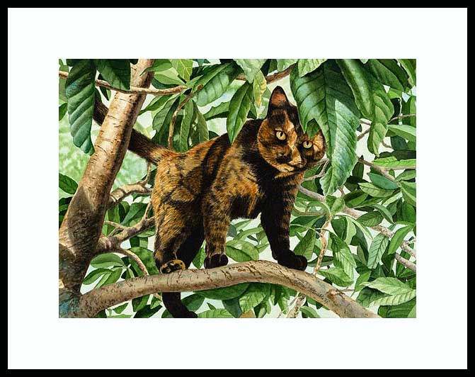 Out on a Limb Framed Limited Edition of an original Drew Strouble cat art watercolor painting of a Tortoise-Shell Tabby Cat our on a limb in a tree. Limited Edition of: 950 Prints. ¥ Overall size: 14 1/2" x 18" incl. 2 1/2" mat. ¥ Each print is hand signed, titled & numbered with matching Certificate of Authenticity. All prints are shrink wrapped with a white mat and foamcore backing. Designer Frames are black aluminum with plexiglas.