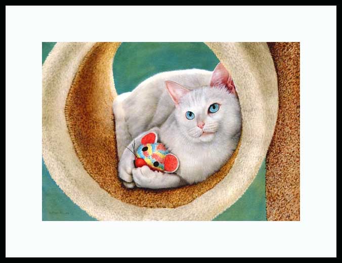 Peep Framed Artist's Proof of an original Drew Strouble cat art watercolor of a White Cat with a cat toy. Limited Edition of: 50 Artist's Proofs. Overall size: 18 1/2" x 24" incl. 2 1/2" mat. Each print is hand signed, titled & numbered with matching Certificate of Authenticity. All prints are shrink wrapped with a white mat and foamcore backing. Designer Frames are black aluminum with plexiglas.