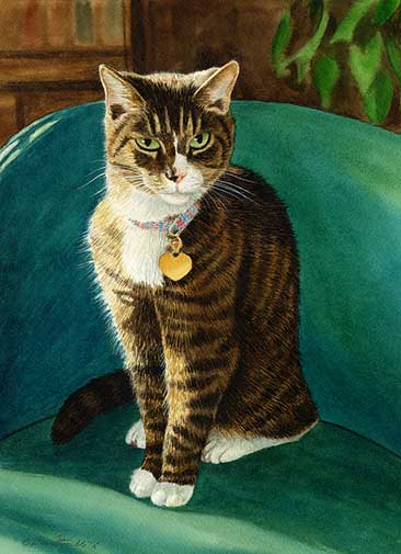 Pepper is a portrait of a fabulous Mixed Tabby sitting on a bar stool, basking in warm natural sunlight. Is it happy hour yet? This cat art print verison by Drew Strouble is a Matted Open Edition Mini Print with an overall size of 9 3/4" x 11 5/8" including a 2" white mat with a black beveled edge.