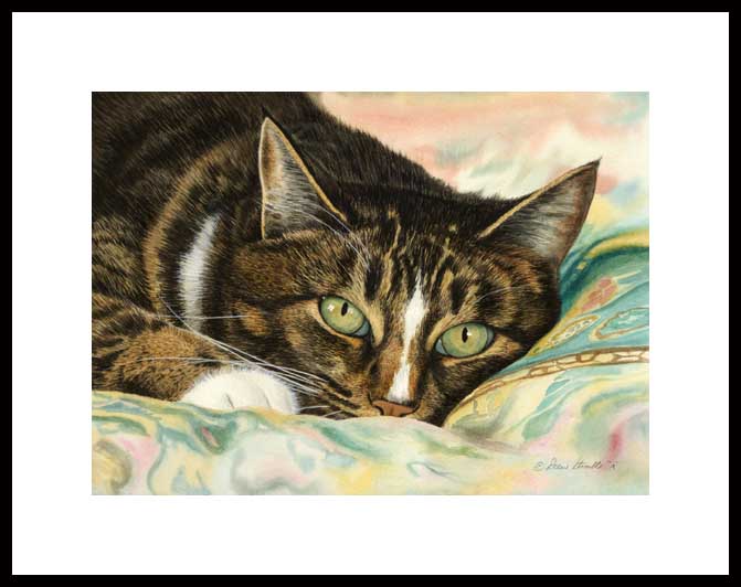 Pillow Talk Framed Artist's Proof of an original Drew Strouble cat art watercolor of a Tabby Cat resting on a pillow. Limited Edition of: 50 Artist's Proofs. Overall size: 14 1/2" x 18" incl. 2 1/2" mat. Each print is hand signed, titled & numbered with matching Certificate of Authenticity. All prints are shrink wrapped with a white mat and foamcore backing. Designer Frames are black aluminum with plexiglas.