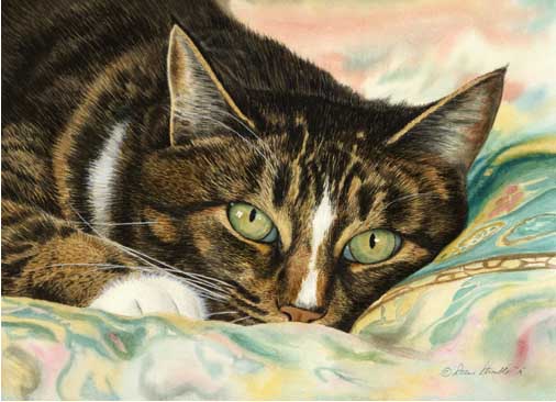 Pillow Talk Matted Open Edition Mini Print of an original Drew Strouble cat art watercolor of a Tabby Cat resting on a pillow. 9 3/4" x 11 5/8" incl. 2" mat. Each print is hand signed. All prints are shrink wrapped with a white mat and foamcore backing.