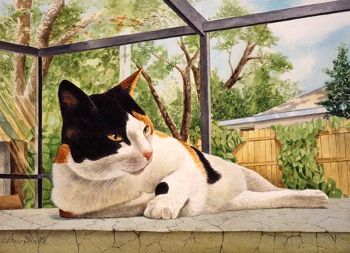 Poolside Matted Open Edition Mini Print of an original Drew Strouble cat art painting of a Calico Cat lounging at poolside. Open Edition Mini Prints ¥ 8 7/8" x 10" incl. 2" mat ¥ Each print is hand signed and titled.