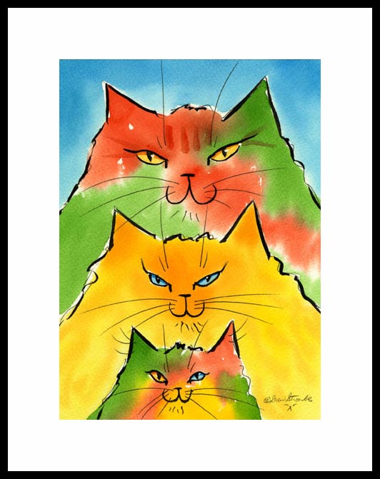 This cat art print version by Drew Strouble is a Framed Artist's Proof with an overall size of 14 1/2" x 18" including a 2 1/2" white mat with a black beveled edge. Designer Frames are black aluminum with plexiglas. Limited to an edition of only 50 Artist's Proofs.