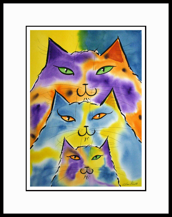 This cat art print version by Drew Strouble is a Framed Artist's Proof with an overall size of 14 1/2" x 18" including a 2 1/2" white mat with a black beveled edge. Designer Frames are black aluminum with plexiglas. Limited to an edition of only 50 Artist's Proofs.