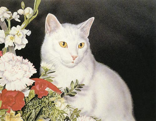 QTip Matted Limited Edition of an original Drew Strouble cat art painting of a green-eyed, White Cat looking very glamorous with a matching flower arrangement. Limited Edition of: 950 Prints. ¥ Overall size: 14" x 16 3/8" incl. 2 1/2" mat. ¥ Each print is hand signed, titled & numbered with matching Certificate of Authenticity. All prints are shrink wrapped with a white mat and foamcore backing.