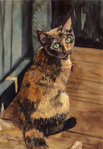 Quiet Trust Card of an original Drew Strouble cat art painting of a Tortoise Shell Tortie Tabby cat looking back at you. Fine Art Greeting Card ¥ Hand mounted Art Print on 5" x 7" white card. ¥ Blank inside. ¥ Matching envelope and clear protective packet included.