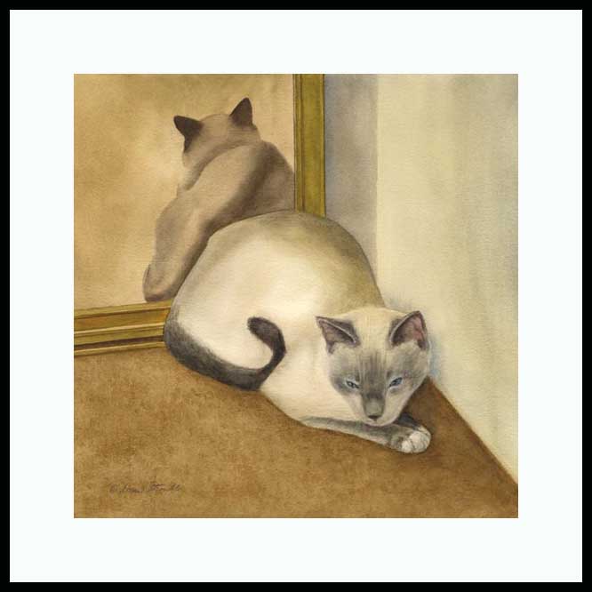 Reflection Framed Artist's Proof of an original Drew Strouble cat art watercolor painting of a Blue Point Siamese Cat in complete repose, painted in homage to Mary Cassatt. Limited Edition of: 50 Artist's Proofs ¥ Overall size: 18" x 18" incl. 2 3/4" mat. ¥ Each print is hand signed, titled & numbered with matching Certificate of Authenticity. All prints are shrink wrapped with a white mat and foamcore backing. Designer Frames are black aluminum with plexiglas.
