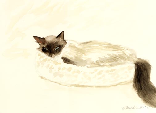 Reminiscing Matted Open Edition Mini Print of an original Drew Strouble cat art watercolor of a Seal Point Birman reminiscing and resting. Open Edition Mini Prints. Overall size: 9 3/4" x 11 5/8" incl. 2" mat. Each print is hand signed and titled. All prints are shrink wrapped with a white mat and foamcore backing.