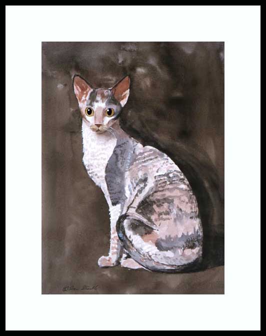 Rex Framed Limited Edition of an original Drew Strouble cat art watercolor painting of a Rex Cat in the traditional watercolor style. Limited Edition of: 950 Prints. ¥ Overall size: 14 1/2" x 18" incl. 2 1/2" mat. ¥ Each print is hand signed, titled & numbered with matching Certificate of Authenticity. All prints are shrink wrapped with a white mat and foamcore backing. Designer Frames are black aluminum with plexiglas.