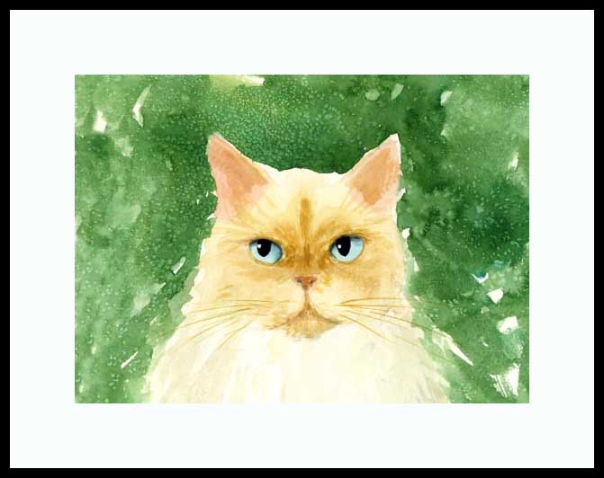 Rusty II Framed Limited Edition of an original Drew Strouble cat art watercolor painting of a Flame Point Himalayan surrounded by garden green. Limited Edition of: 950 Prints. ¥ Overall size: 14 1/2" x 18" incl. 2 1/2" mat. ¥ Each print is hand signed, titled & numbered with matching Certificate of Authenticity. All prints are shrink wrapped with a white mat and foamcore backing. Designer Frames are black aluminum with plexiglas.