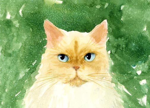 Rusty II Card of an original Drew Strouble cat art watercolor painting of a Flame Point Himalayan surrounded by garden green. Fine Art Greeting Card ¥ Hand mounted Art Print on 5" x 7" white card. ¥ Blank inside. ¥ Matching envelope and clear protective packet included.