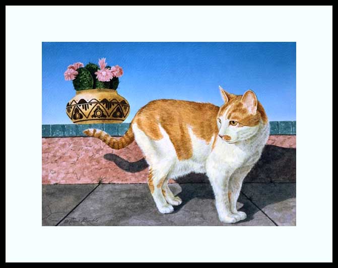 Santa Fe Framed Limited Edition of an original Drew Strouble cat art watercolor painting of an Orange and White Tabby Cat with blue skies, sunshine and Southwestern pottery. Limited Edition of: 950 Prints. ¥ Overall size: 14" x 16 3/8" incl. 2 1/2" mat. ¥ Each print is hand signed, titled & numbered with matching Certificate of Authenticity. All prints are shrink wrapped with a white mat and foamcore backing. Designer Frames are black aluminum with plexiglas.