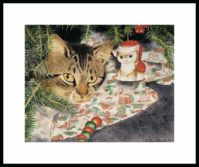 Santa's Helper Framed Open Edition Mini Print of an original Drew Strouble cat art watercolor painting of a Tabby Cat peeking out from under a Christmas tree. Open Edition Mini Prints ¥ Overall size: 8 7/8 x 10 incl. 2" mat. ¥ Each print is hand signed and titled. All prints are shrink wrapped with a white mat and foamcore backing. Designer Frames are black aluminum with plexiglas.
