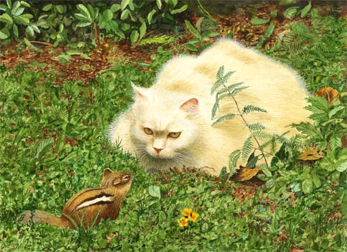 Shall We Dance? Card of an original Drew Strouble cat art watercolor of a cream colored Persian Cat Mix and a chipmonk. Fine Art Greeting Card. Hand mounted Art Print on 5" x 7" white card. Blank inside. Matching envelope and clear protective packet included.