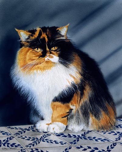 Sheeba Matted Limited Edition of an original Drew Strouble cat art watercolor painting of a Calico Persian Cat. Limited Edition of: 950 Prints. Overall size: 14" x 16 3/8" incl. 2 1/2" mat. Each print is hand signed, titled & numbered with matching Certificate of Authenticity. All prints are shrink wrapped with a white mat and foamcore backing.