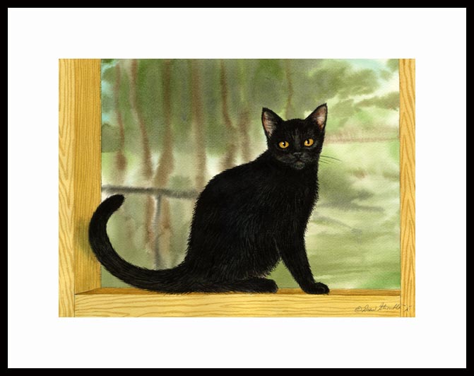 Shadow Framed Open Edition Mini Print of an original Drew Strouble cat art watercolor of a Black cat with a tail that asks questions. Open Edition Mini Prints. Overall size: 9 3/4" x 11 5/8" incl. 2" mat. Each print is hand signed and titled. All prints are shrink wrapped with a white mat and foamcore backing. Designer Frames are black aluminum with plexiglas.