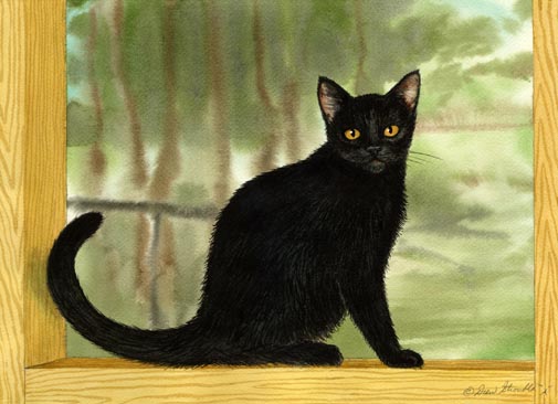Shadow Matted Limited Edition of an original Drew Strouble cat art watercolor of a Black cat with a tail that asks questions. Limited Edition of: 950 Prints. Overall size: 14 1/2" x 18" incl. 2 1/2" mat. Each print is hand signed, titled & numbered with matching Certificate of Authenticity. All prints are shrink wrapped with a white mat and foamcore backing.