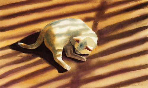 Siesta Card of an original Drew Strouble cat art painting of a Flame Point Siamese White Cat asleep in the shadows. Fine Art Greeting Card ¥ Hand mounted Art Print on 5" x 7" white card. ¥ Blank inside. ¥ Matching envelope and clear protective packet included.