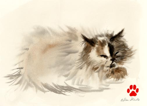Sleeping Beesh Matted Artist's Proof of an original Drew Strouble cat art watercolor painting of a Tortie Point Himalayan Cat napping. Limited Edition of: 50 Artist's Proofs ¥ Overall size: 14 1/2" x 18" incl. 2 1/2" mat. ¥ Each print is hand signed, titled & numbered with matching Certificate of Authenticity. All prints are shrink wrapped with a white mat and foamcore backing. Designer Frames are black aluminum with plexiglas.