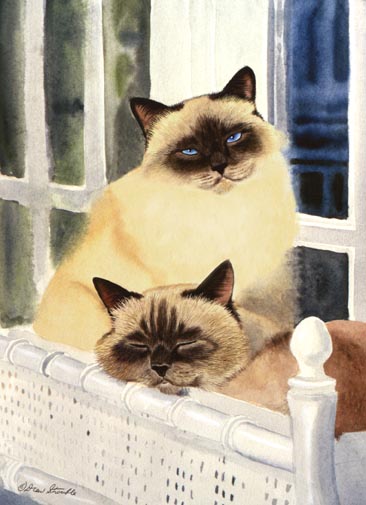 Sleepy Heads Matted Artist's Proof of an original Drew Strouble cat art watercolor painting of two Seal Point Birman or Seal Point Himalayan Cat litter mates cuddling. Limited Edition of: 50 Artist's Proofs ¥ Overall size: 14 1/2" x 18" incl. 2 1/2" mat. ¥ Each print is hand signed, titled & numbered with matching Certificate of Authenticity. All prints are shrink wrapped with a white mat and foamcore backing.