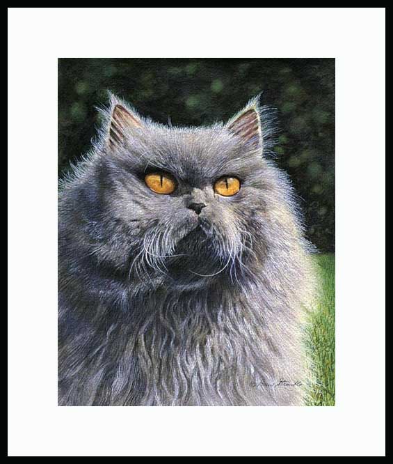 Smokey Framed Limited Edition of an original Drew Strouble cat art painting of a magnificent Gray Persian Cat. Limited Edition of: 950 Prints. ¥ Overall size: 14" x 16 3/8" incl. 2 1/2" mat. ¥ Each print is hand signed, titled & numbered with matching Certificate of Authenticity. All prints are shrink wrapped with a white mat and foamcore backing. Designer Frames are black aluminum with plexiglas.
