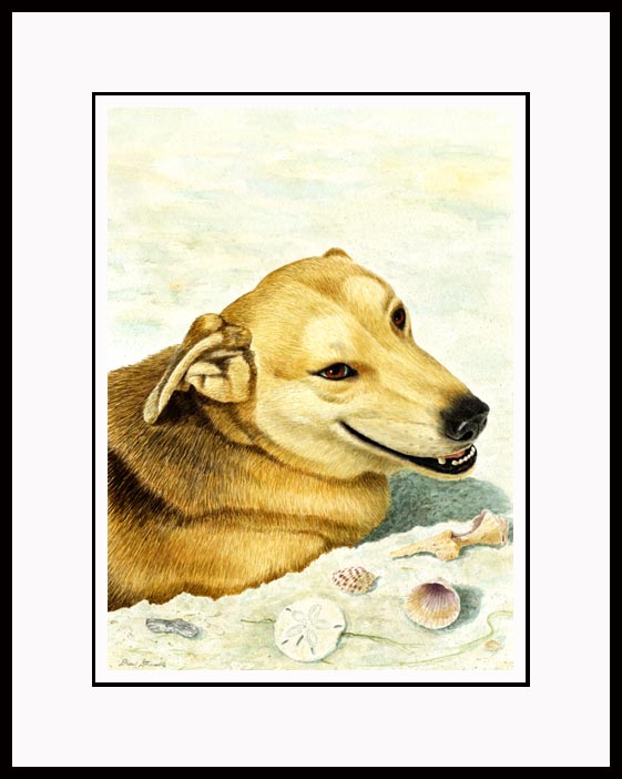 Sparkles Framed Open Edition Mini Print of an original Drew Strouble dog art watercolor painting of a Golden Retriever/German Shepherd Mix Heroic Guide Dog at Siesta Key beach in Florida with sea shells. Open Edition Mini Prints. Overall size: 9 3/4" x 11 5/8" incl. 2" mat. Each print is hand signed and titled. All prints are shrink wrapped with a white mat and foamcore backing. Designer Frames are black aluminum with plexiglas.